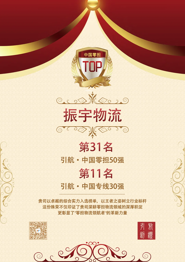 振宇物流榮膺2025引航·中國零擔50強,位列第31名。2025引航·中國專線30強,位列第11名。這標志著我司在零擔物流領(lǐng)域的快速發(fā)展和專業(yè)化能力獲得行業(yè)認可。風(fēng)正時濟,自當破浪揚帆。任重道遠,更需策馬揚鞭。振宇物流愿以本次殊榮為新起點,不斷開拓創(chuàng)新、與時俱進,繼續(xù)在物流與供應(yīng)鏈服務(wù)的星辰大海中,書寫屬于中國物流企業(yè)的新篇章!