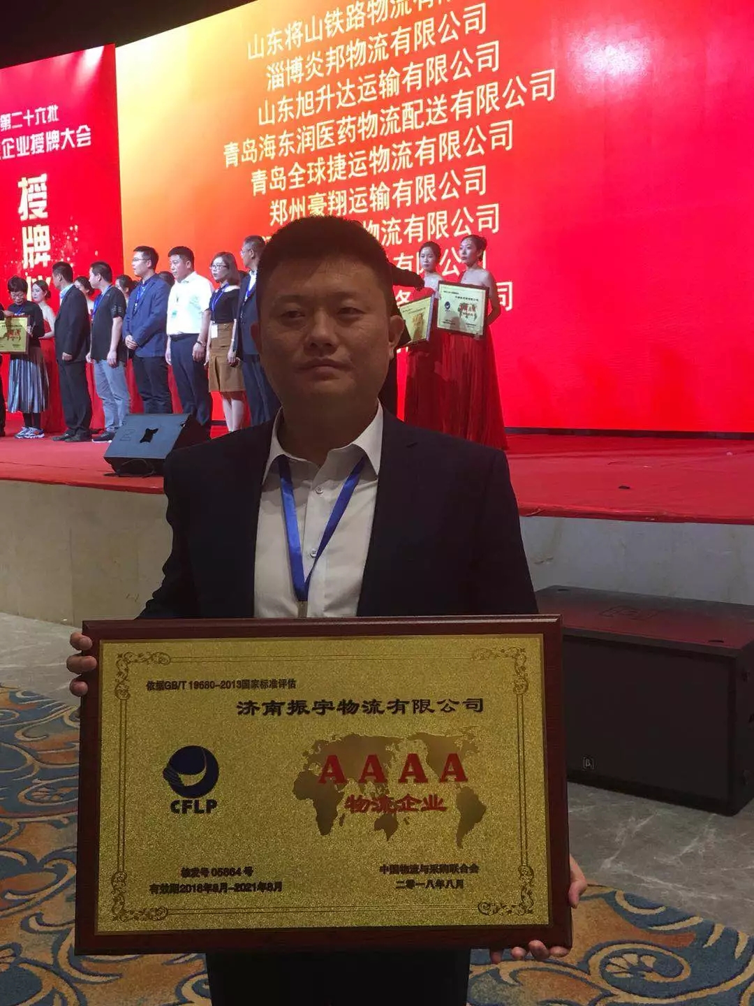 2018年9月16日,由中國物流與采購聯(lián)合會主辦的A級物流企業(yè)授牌大會暨物流業(yè)創(chuàng)新發(fā)展論壇在吉林省長春市隆重舉行。會議對本批A級物流企業(yè)進行了集中授牌,濟南振宇物流有限公司榮獲國家AAAA級物流企業(yè),總經(jīng)理張憲振代表公司出席會議并接受授牌。