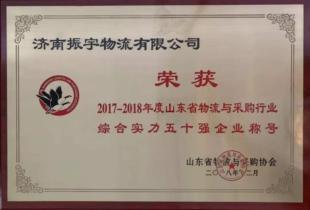振宇物流經(jīng)山東省物流與采購協(xié)會綜合評審,榮獲2017-2018年度山東省物流與采購行業(yè)綜合實力五十強(qiáng)企業(yè)稱號。