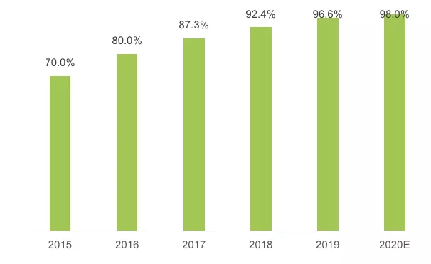 圖2 2015—2020年快遞網(wǎng)點(diǎn)鄉(xiāng)鎮(zhèn)覆蓋率變化情況