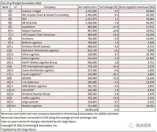 7月11日消息,第三方物流咨詢機構Armstrong&Associates.Inc發(fā)布了最新的2022年航空貨代TOP25排名。前25家空運貨代公司的總貨量同比下降了6.3%,達到1690萬噸。其中,前五名延續(xù)去年的排名,分別為德迅(K+N)、DHL、DSV、DB Schenker、Expeditors。德迅憑借223萬噸的空運貨量,進一步擴大了對DHL的領先優(yōu)勢,再次成為全球最大航空貨運代理公司。排名第二的DHL去年空運貨物量下降了9.3%,達到190萬噸,反映出了整體空運貨代市場的情況。