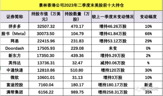 根據(jù)13F文件,截至6月30日,景林資產(chǎn)在美股持有28只證券,合計(jì)持倉(cāng)市值達(dá)到20.69億美元(約合人民幣149.76億元),環(huán)比增幅約20%。具體來看,二季度末其美股前十大重倉(cāng)股分別是拼多多、臉書母公司Meta、網(wǎng)易、Doordash、新東方、英偉達(dá)、中通快遞、微軟、富途控股、滿幫集團(tuán),中概股依舊占主導(dǎo)。