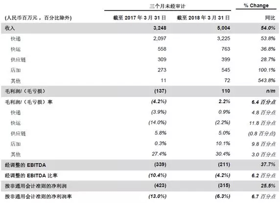5月10日,百世集團公布2018年第一季度未經(jīng)審計財務(wù)業(yè)績:一季度總收入50.04億元人民幣,同比增長54%;毛利潤1.1億元人民幣,與去年同期相比提升6.4%。