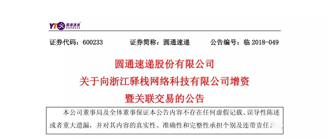 根據(jù)公告,圓通擬以自有資金4.5億元人民幣對浙江驛棧進(jìn)行增資,其中1575萬元人民幣認(rèn)繳新增注冊資本,4.3425億元人民幣計(jì)入資本公積金。本次投資后,公司將持有浙江驛棧1575萬元人民幣注冊資本,持股占增資完成后比例為6.28%。