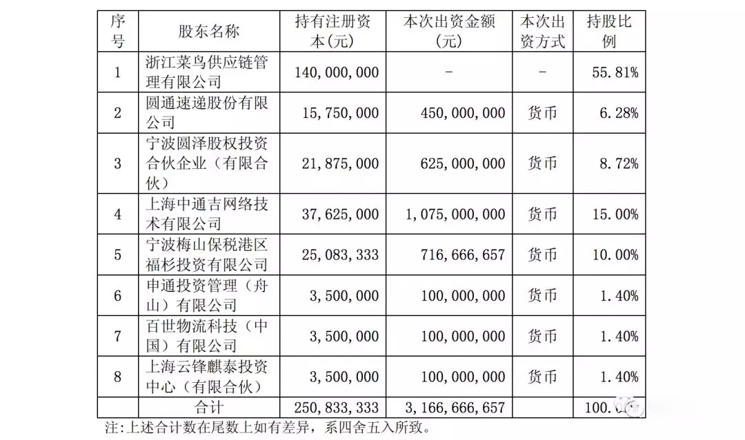 公告顯示,2018年第一季度,浙江驛棧總資產(chǎn)6922萬元,總負(fù)債7257.9萬元,凈資產(chǎn)-335.9萬元,營業(yè)收入483.3萬元,凈利潤-1.14億元。本次增資前,浙江驛棧由浙江菜鳥供應(yīng)鏈100%控股,本次增資后浙江驛棧的股本結(jié)構(gòu)如下: