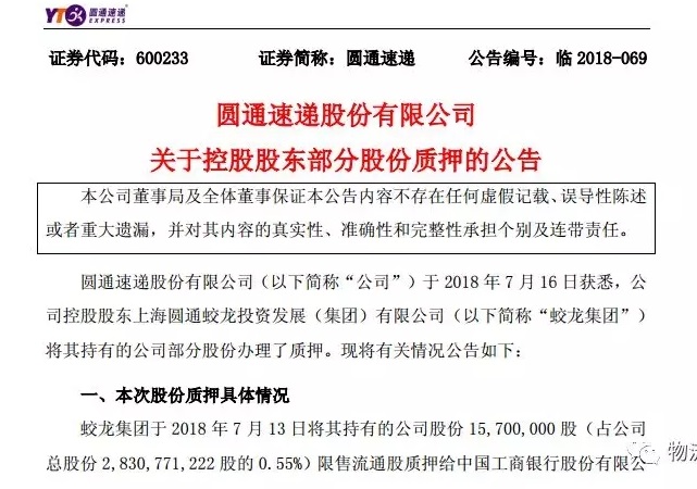 值得一提的是,這是圓通本月第二次發(fā)布蛟龍集團(tuán)質(zhì)押股份的公告。在7月3日,圓通發(fā)布公告,蛟龍集團(tuán)于2018年6月29日將其持有的公司股份660萬股(占公司總股的0.23%)限售流通股質(zhì)押給杭州銀行股份有限公司深圳分行,質(zhì)押期限為2018年6月29日至2019年11月15日。