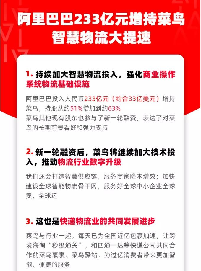 阿里巴巴集團11月8日宣布,為持續(xù)加大智慧物流投入,強化商業(yè)操作系統(tǒng)物流基礎(chǔ)設(shè)施,已領(lǐng)銜完成對菜鳥網(wǎng)絡新一輪增資。阿里巴巴通過增資和購買老股的方式,投入人民幣233億元(約合33億美元),持有菜鳥股權(quán)從約51%增加到約63%。菜鳥其他現(xiàn)有股東也參與了新一輪融資,表達了對菜鳥的長期前景看好和強力支持。